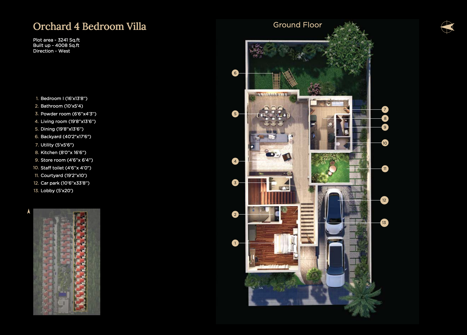 The 4 bedroom independent luxury villas are available in both east and west facing options. These homes sit on land parcels of 3,279 square feet and offer a generous built-up area of 4,050 square feet, allowing for expansive living spaces, comfortable bedrooms, and fluid indoor–outdoor movement.
